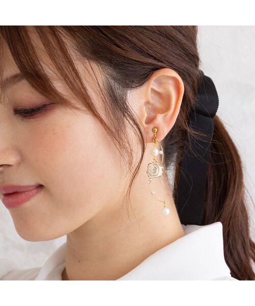 小さなパール調ビーズにカメリア風ローズを合わせたローズティアラオリジナルデザインのイヤリング。