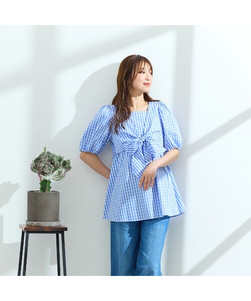 ふんわり袖にフロントリボンのデザインがポイントのギンガムチェックブラウス。