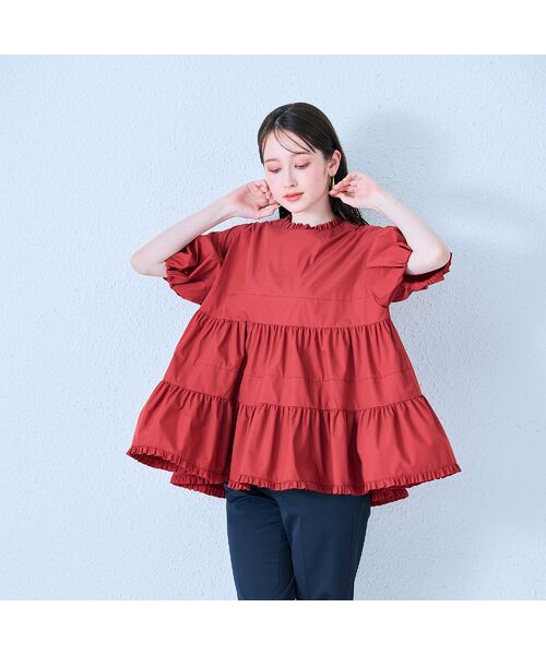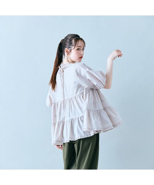 ・衿ぐりと裾に細巾のミニフリルが程よく可愛さをアピール。