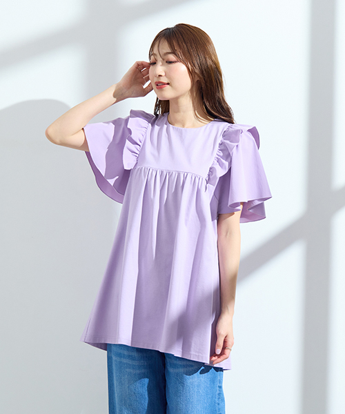 フリル袖とヨーク切替に乗せたショルダーフリルがフェミニンなカットソー。