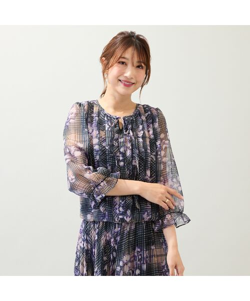 ローズティアラオリジナルのチェックに陰影感のある花柄がシックなバルーンブラウス。