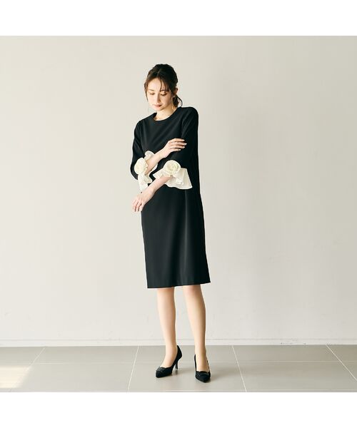 ・袖口にあしらったフラワーコサージュが、動くたびにロマンティックに弾むミディ丈ワンピース。