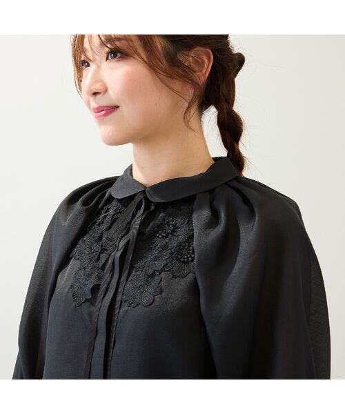 立体感のあるボリューム袖が印象的な、フェミニンな襟付きブラウス。