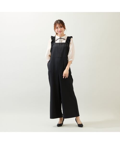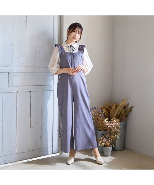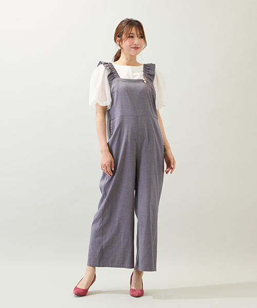 フリルの肩ひもが可愛らしいアクセントになったサロペット。