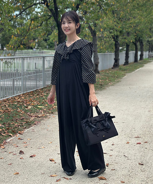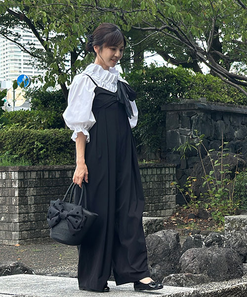 フリルやポケット口のパールなど甘めのディテールに、ゆったりとしたワイドシルエットがおとな可愛さを演出します。