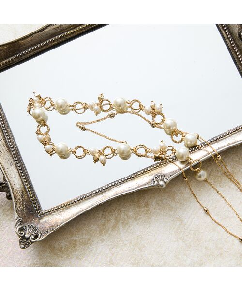 小さなパール調ビーズとゴールドのボールチェーンが繊細で華やかな2連デザインのネックレス。