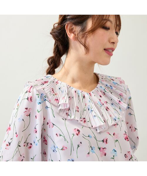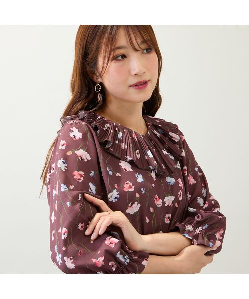 ローズティアラオリジナルのフラワープリントが秋らしいシックなバルーンヘムブラウス。