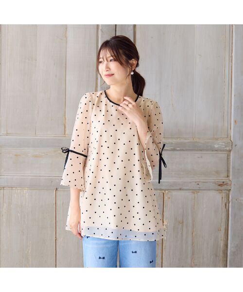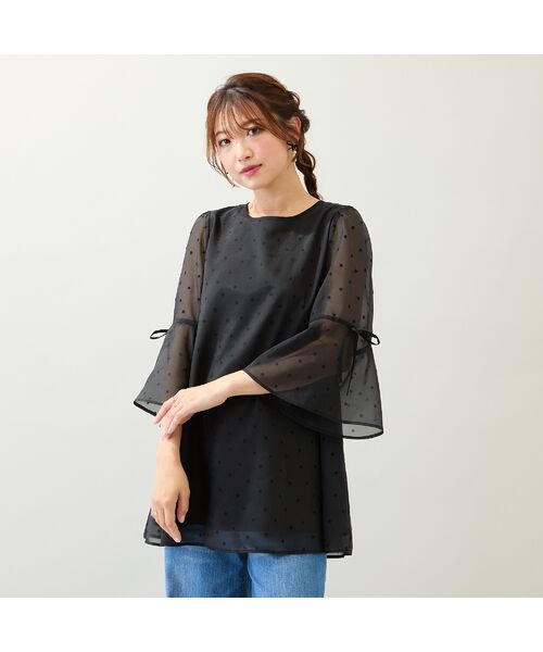 オーガンジーにドットフロッキーを重ねた、落ち着いた印象のフレア袖ブラウス。