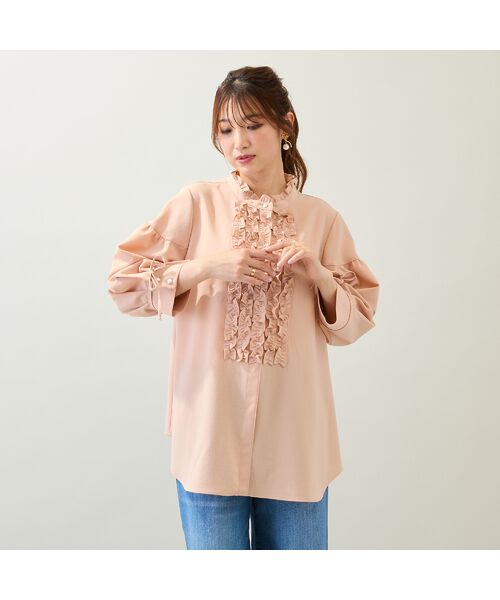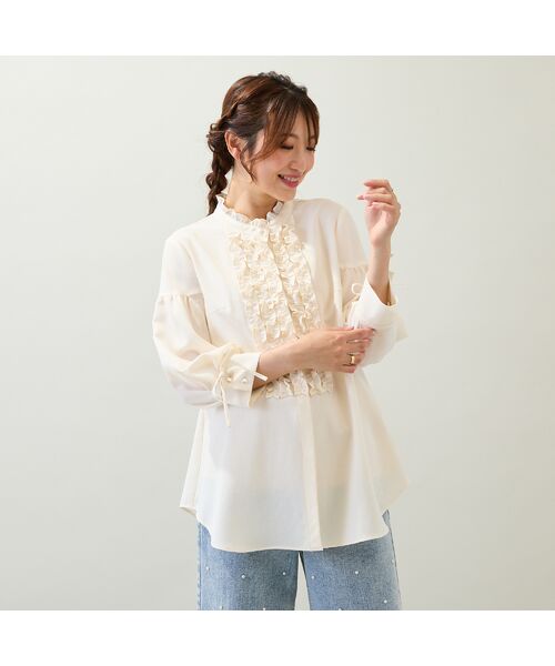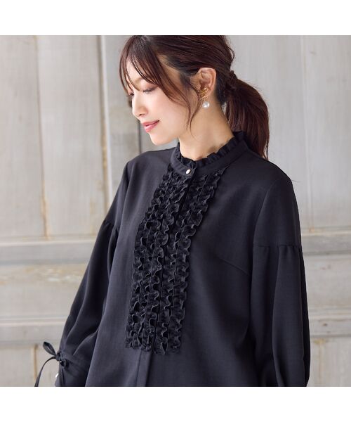 首に沿うフリルカラーと、フロントのボリュームフリルが華やかでおとな可愛い印象に。