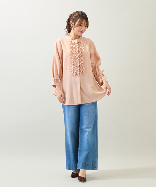 首に沿うフリルカラーと、フロントのボリュームフリルが華やかでおとな可愛い印象に。