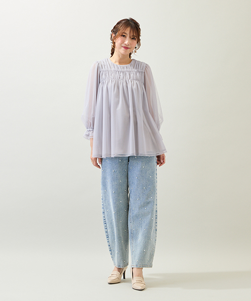 チュールを二枚重ねたキュートなデザインが目を引くカットソー。