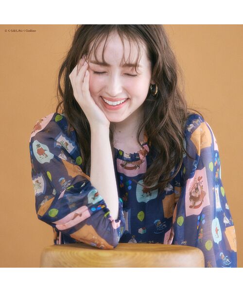 ・細かなフリルの衿が程よく甘さをプラスしたコラボプリントのブラウス。