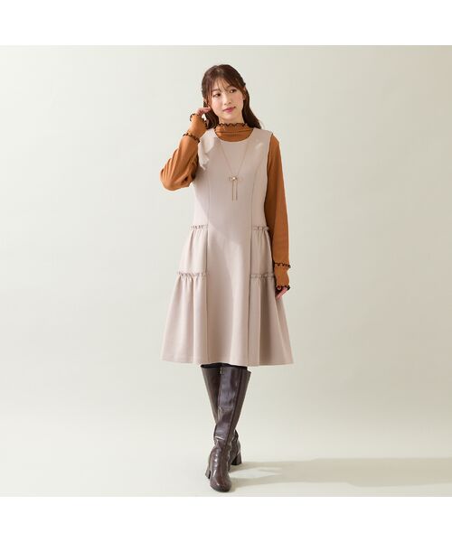 可愛らしい印象を与えてくれるティアードデザインのジャンパードレス。