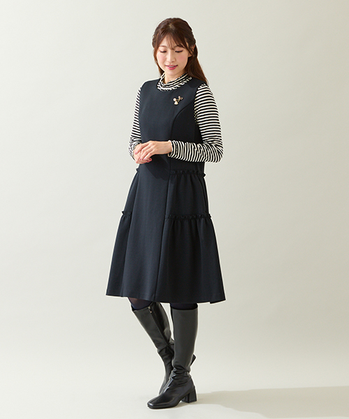 可愛らしい印象を与えてくれるティアードデザインのジャンパードレス。