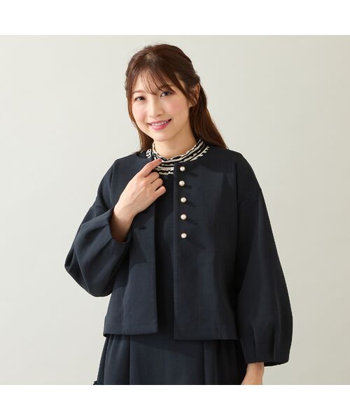 パールボタンとタックを入れたランタンスリーブがクラシカルな印象を演出するノーカラージャケット。