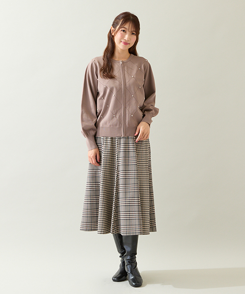 クルーネックにパール調スタッズ×アーガイルが上品なニットカーディガン。
