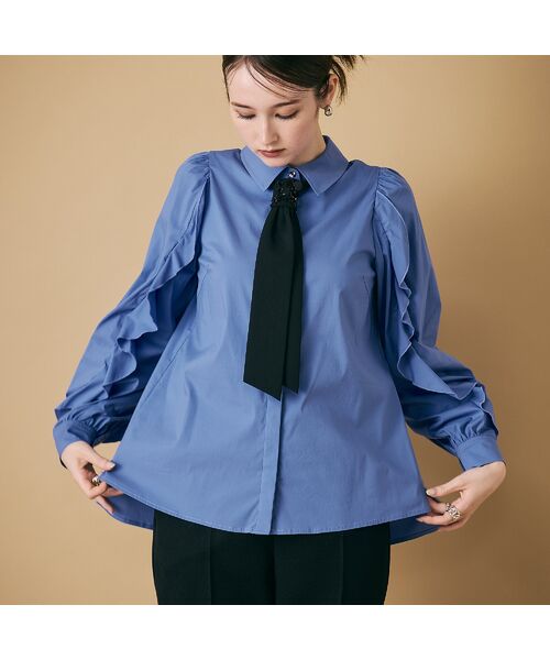 ・袖にフリルがプラスされ、女性らしさあふれる本体に取り外しのネクタイがついたデザインシャツ。
