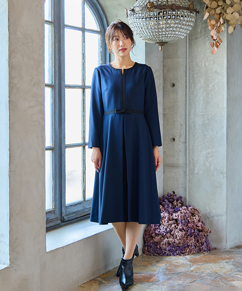 ・ネックライン、フロント、ウエストの配色切替ですっきりと見えるデザインに