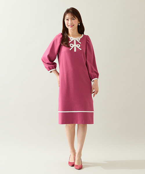【伸縮性◎/イージーケア】配色リボンワンピース