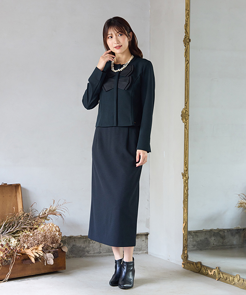 素材選びからデザイン、パターンまでを一貫して行い、タックの向きやギャザー分量、フリル位置などを36・38・40号と42・46・50号では調整し、パターンを分けることで美しいシルエットと着心地の良い服を提案します。