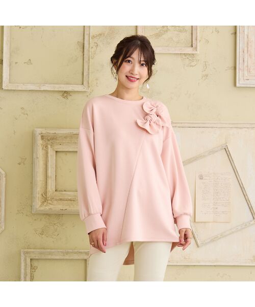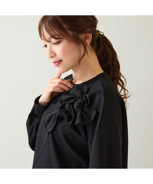胸元に立体的なリボンをあしらったオーバーサイズのプルオーバー。