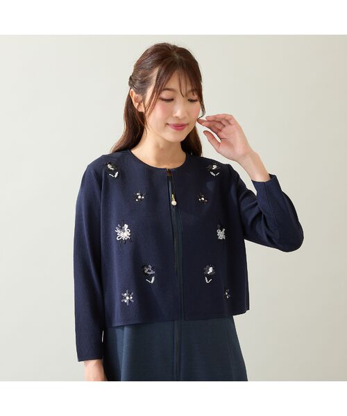 スパンコールやビーズと刺繍であしらったフラワーモチーフを前身ごろ全体にちりばめた上品で華やかなクロップド丈ニットカーディガン。
