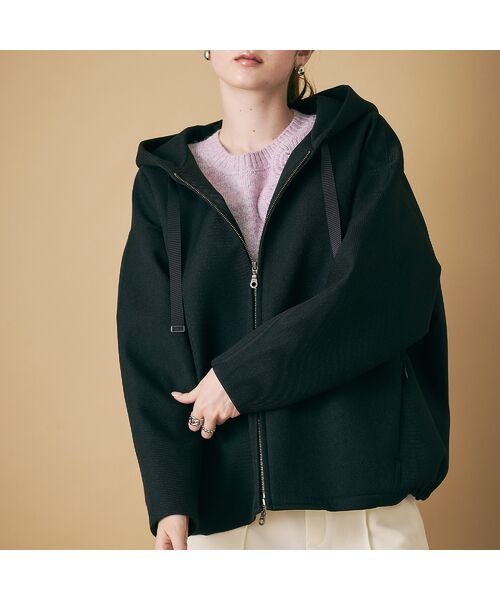 ・フード端の太めのグログランテープ使いや、裾にダーツをとって丸みのあるシルエットを作り出したこだわりのパーカー。