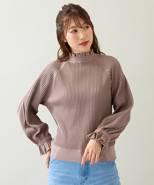 ・フリルのスタンドカラーと袖がフェミニンコーデに欠かせないニットプルオーバー