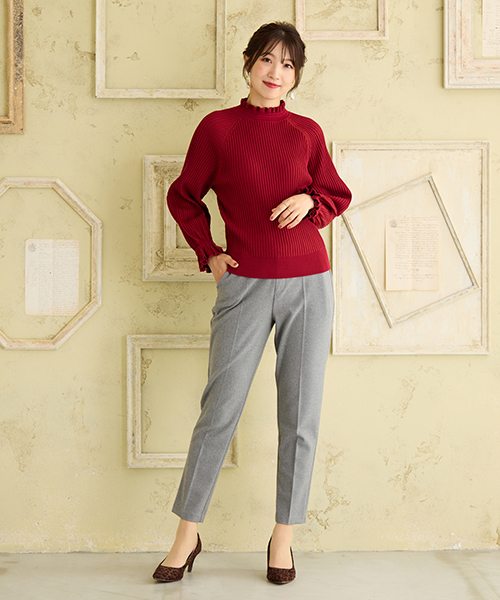 ・フリルのスタンドカラーと袖がフェミニンコーデに欠かせないニットプルオーバー