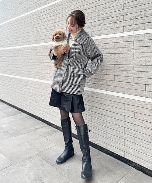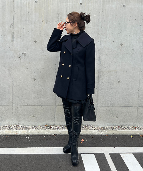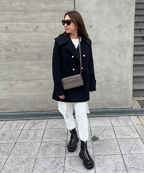・大きめの襟とリラックスしたシルエットがポイントのハーフ丈のPコート。