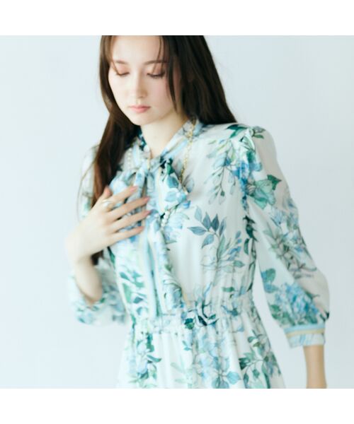 ・華やかなギャザーとリボンをあしらい、1枚で着映えるデザインに仕上げた主役級のプリントワンピース。