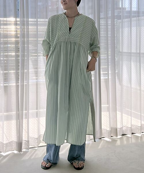 後ろ衿ぐりのギャザーと、全体的なゆったりサイジングで風通し良く快適な着心地。