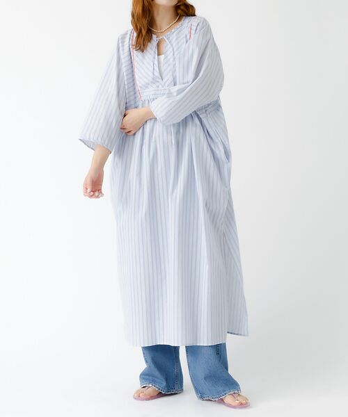 胸ヨークはストライプを柄に変化を出す為バイアス使い、ヨーク端に細いパイピングテープを使用。