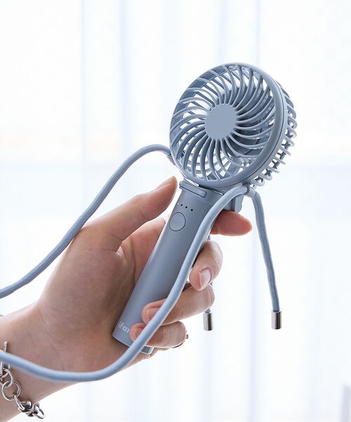 持ち手を折りたたんでデスクファンにしたり、ネックストラップをつけて首から下げたり、シーンに合わせて自由に使えます。