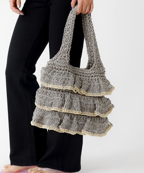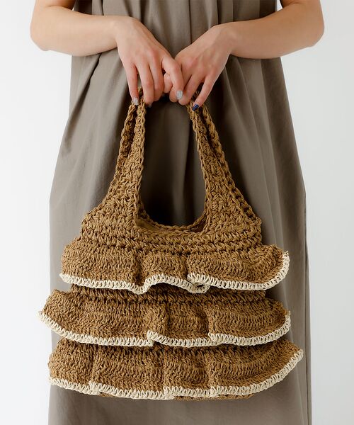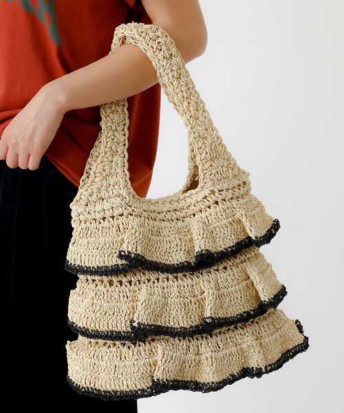 リゾートムード高まるペーパー素材を使用したフリルデザインのトートバッグ。