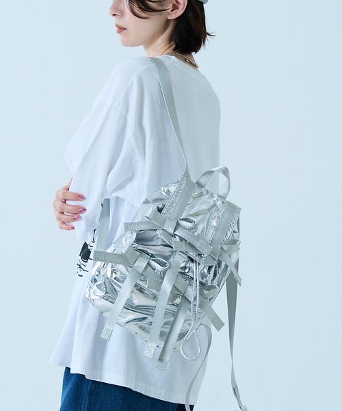トレンドである複数のリボンがポイントのミニバッグパック。モチっとした柔らかなフォルムでふんわり優しい雰囲気。小ぶりではありますが、外ポケットに内側にもポケットが付き収納しやすい。ドローストリングでカバっと口が開きスムーズに出し入れしやすい◎。ショルダーはお好みの長さに調整可能。コーディネートのアクセントになるリボンデザインです。