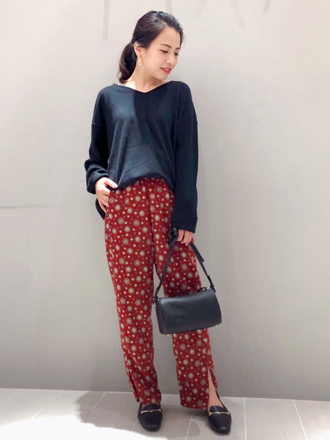 秋の柄パンツコーデ 肌寒い時期になっており、久々に 柄物のパンツを履きたくなってます。 エンジ色の小紋柄はとても秋らしいです。 スエードタッチの微起毛素材なので、 冬にも履けるイージーパンツになります。 シンプルなニットに合わせれると◎