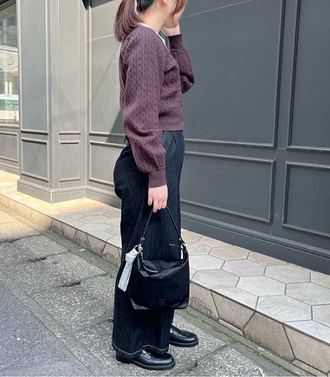 短いレザーベルトでも肩掛けができて、ショルダー持ちでも収まりのすっきりとしたシルエットに。