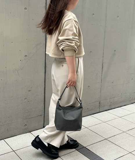モノグラムモチーフの刺繍がさりげないアクセントとなり、シンプルな装いにも華をプラス。