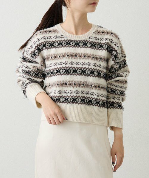 メリノウールをベースに、フェザーヤーンや和紙ヤーンなど異素材を組み合わせて編み上げたフェアアイル柄のクロップドニット。