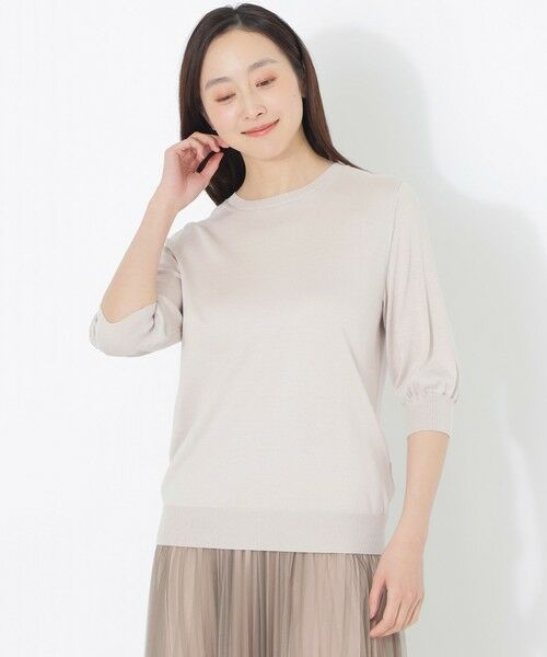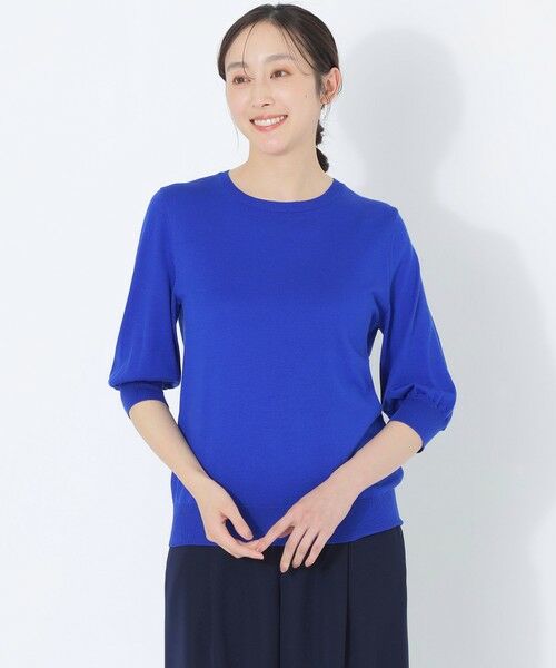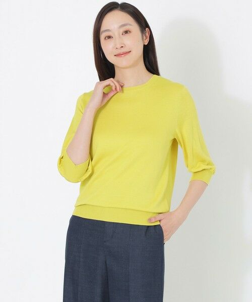 発色の美しさを活かしたシンプルな五分袖で、身頃部分は透け感を抑えるためのフロート編みに、袖は天竺組織で編み立てています。ふんわりと空気をはらんだエアリーな着心地が上品な一枚です。