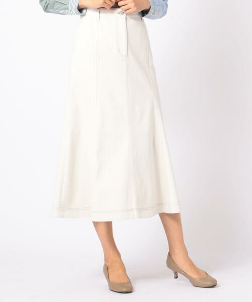 爽やかな印象を与える、きれいなAラインシルエットのホワイトデニムスカート。右バックウエストのロゴ入りパッチやステッチワークがアクセントに。ストレッチの効いたデニムを使用しているのでヒップ周りが楽になり、足捌きもスムーズに行えます。model:T.171/B.77/W.58/H.84着用サイズ:38