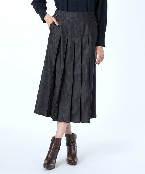 フロントにプリーツを施して、動きのあるデザインに仕上げたスカート。長めの丈感で上品に穿きこなせます。サイドポケットの口には配色のジグザグステッチを施して、アクセントをプラス。霜降り感が見られる表情豊かなシャンブレー生地を使用しています。同素材のジャケットとのセットアップスタイルも素敵です。※商品画像はサンプルを使用しているため、実際の商品と色味などの仕様が異なる場合がございます。予めご了承ください。model:T.175/B.83/W.59/H.89着用サイズ:38