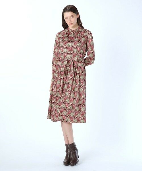 フラワー柄のリバティプリント生地を使用した、袖付きワンピース。トップは前開きのシャツデザインで、包みボタンやタックによる立体感がポイントに。スカートラインはたっぷりと広がり、共布のリボンベルトを結んでクラシカルに着こなせます。シワになりにくい、ポリエステル100%素材です。※商品画像はサンプルを使用しているため、実際の商品と色味などの仕様が異なる場合がございます。予めご了承ください。model:T.175/B.83/W.59/H.89着用サイズ:38