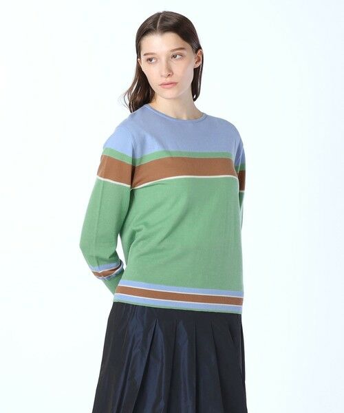 洗練された配色が目を引く、マルチボーダー柄のクルーネックニット。パンツ・スカート、どちらとも合わせやすいシルエットがポイントです。選りすぐりのウールを用いたハイゲージニット素材で、肌触りの良さにも優れているのが特徴。シンプルなボトムと合わせた、ボーダーが主役のコーディネートがおすすめです。※商品画像はサンプルを使用しているため、実際の商品と色味などの仕様が異なる場合がございます。予めご了承ください。model:T.175/B.83/W.59/H.89着用サイズ:38