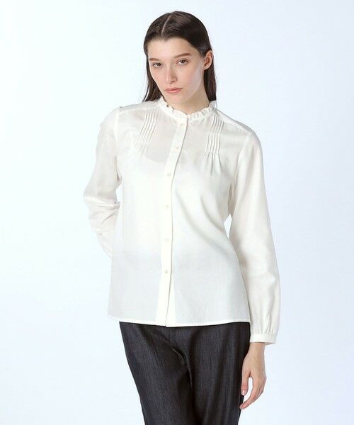 ピンタックやフリルのスタンドカラーなど、ディテールによって上品な華やかさを演出したブラウス。ホワイトの色味は清潔感を印象付けて、幅広いシーンで活用できます。一枚着として取り入れるのはもちろん、ジャケットやカーディガンのインナーとしても重宝するアイテム。柔らかく心地よい肌触りも魅力です。※商品画像はサンプルを使用しているため、実際の商品と色味などの仕様が異なる場合がございます。予めご了承ください。model:T.175/B.83/W.59/H.89着用サイズ:38