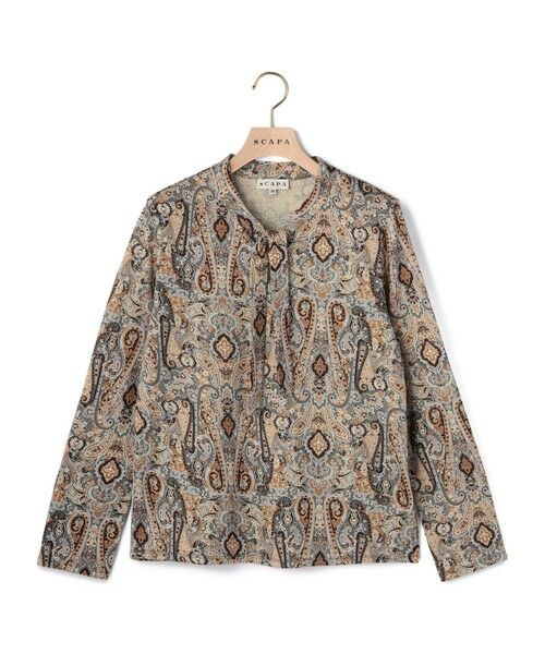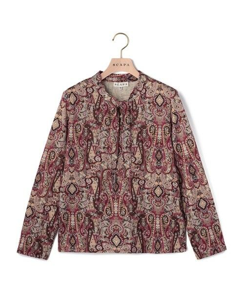 細かなディテールのサラサプリント柄が着こなしのアクセントになる長袖カットソー。首元のボウタイもスタイリッシュなデザインポイント。ウールジャージー素材であたたかく、スムースな生地で着心地も抜群。お手持ちのボトムに合わせて、華やかでおしゃれなお出かけコーディネートが実現する一枚です。※商品画像はサンプルを使用しているため、実際の商品と色味などの仕様が異なる場合がございます。予めご了承ください。