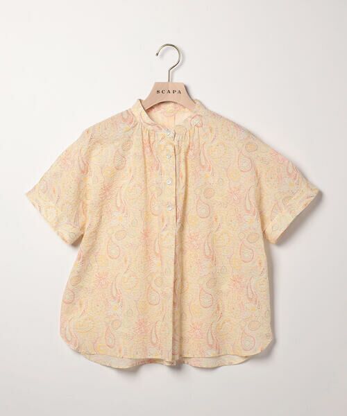 エスニック感あふれるペイズリー柄を、淡く明るい配色でデザインしたブラウス。スタイリッシュな印象のスタンドカラーを採用しています。衿回りにはさりげなくギャザーを施して、フェミニンをプラス。薄手の生地感の軽やかさが夏らしいリゾートコーディネートにもぴったりです。着丈は少し短めですっきりと着こなせます。※商品画像はサンプルを使用しているため、実際の商品と色味などの仕様が異なる場合がございます。予めご了承ください。model:T.172/B.82/W.63/H.93着用サイズ:38