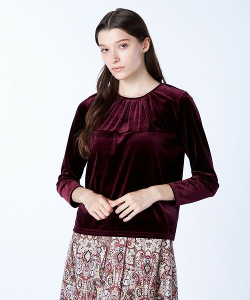 光沢感のあるベロア生地で仕立てたエレガントな長袖カットソー。ストレッチ素材で身体の動きにフィットし、着心地も快適。首元のタックで出来るフロントのナチュラルなドレープ感がフェミニンなデザインディテール。シンプルなデザインで様々なスタイルのボトムと好相性。シックなお出かけスタイリングが叶う一枚です。※商品画像はサンプルを使用しているため、実際の商品と色味などの仕様が異なる場合がございます。予めご了承ください。model:T.175/B.83/W.59/H.89着用サイズ:38