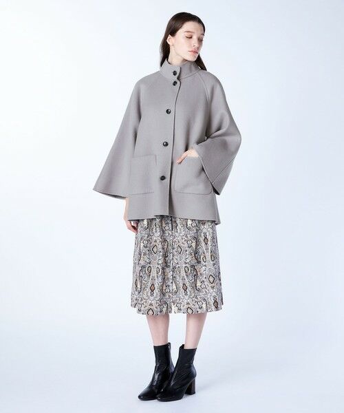 フレアに広がるシルエットがエレガントかつフェミニンな雰囲気を演出するコート。ウール混合であたたかな肌触りの生地感。フロントポケットがアクセントのシンプルなデザイン。フレアな袖やゆとりのあるシルエットがトレンド感あるデザインポイント。おしゃれなお出かけコーディネートにぴったりな一枚です。※商品画像はサンプルを使用しているため、実際の商品と色味などの仕様が異なる場合がございます。予めご了承ください。model:T.175/B.83/W.59/H.89着用サイズ:38